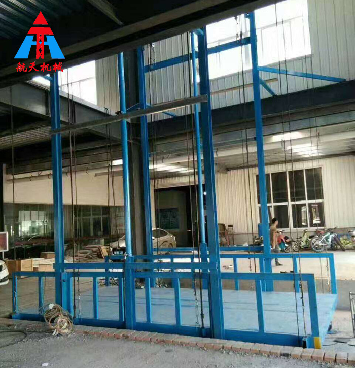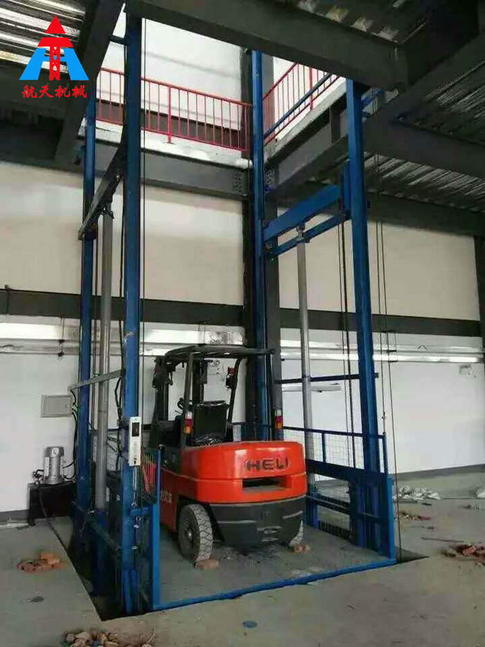 導軌式汽車升降平臺,主要用于樓層間高空貨物運輸。載重1-50噸,升高高度1-25米。室內、室外均可安裝導軌式升降機也叫做液壓提升機,提升高度高,采用旁置油缸,運行平穩、噪音低、維修方便、使用壽命較長,停電時,可使用手動應急下降,安全、方便、快捷、實用,地坑深度一般為15cm-30cm,頂層高度不受限制,可根據現場環境定做用,適合2-3層鋼結構或混凝土廠房,內外部均可使用。