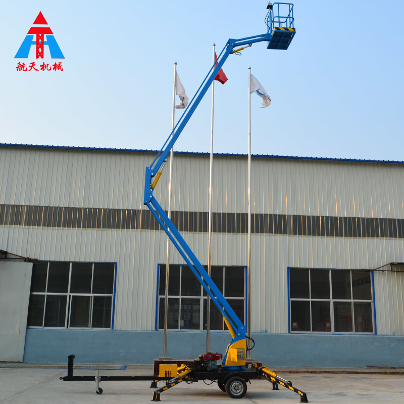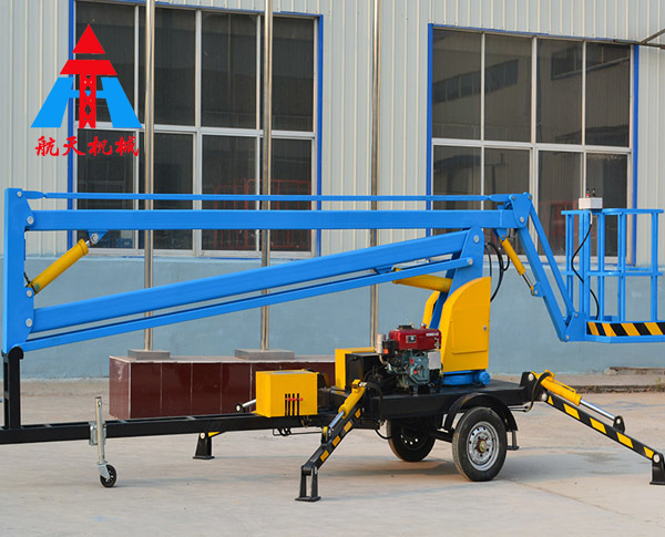 拖車折臂式升降平臺:可以掛在汽車上,與汽車同步,適合野外高空作業。升降方式:1、用380-220V電源2、用電源不方便,可以用電瓶驅動升降。外型美觀,行走方便。