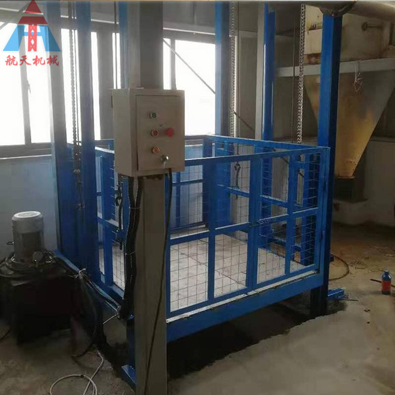 導軌式升降貨梯液壓系統的組成由防墜、上下層門互動連鎖看,可以實現多樓層的控制;同時設有溢流閥、手動泵、管路破裂閥等安全裝置使得設備的安全性能有極大的保障。對于導軌式升降機的臺面設計,臺面以防滑紋鋼板材料,臺面平整且防滑耐用。